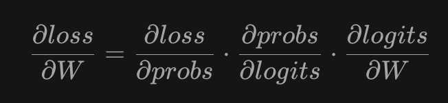 loss = -log(probs[target])梯度链条:W → logits → probs → loss