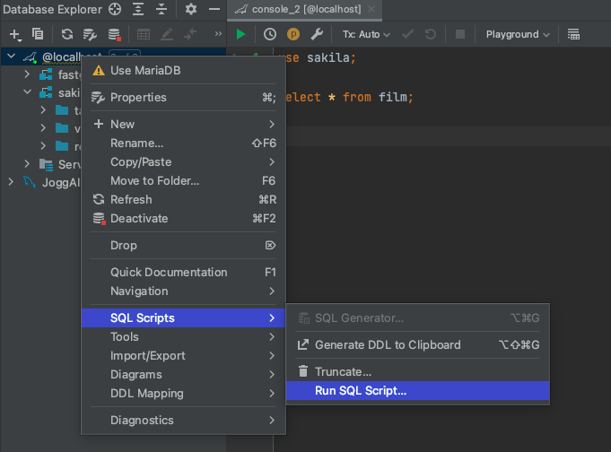 打开 DataGrip,创建数据库 create database sakila;,将表结构和数据导入,先执行 sakila-schema.sql 文件,再执行 sakila-data 文件